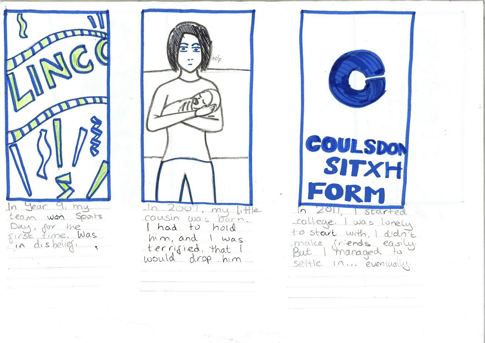 As stated before, the title of this piece is 'Panorama Boxes', which could affect the way a viewer sees the piece. In the way it's presented, a landscape style emphasises this, or scenes of her life which is unfolded before the viewer. Or, the fact that it's inside of a brief case may symbolise her life in a "nut shell" or "brief case". The theme of the piece may also be her own experiences and encounters, which links in with our exam theme. Also included, are drawings of people, who could be people whom the artist knows, and who she may share a relationship.